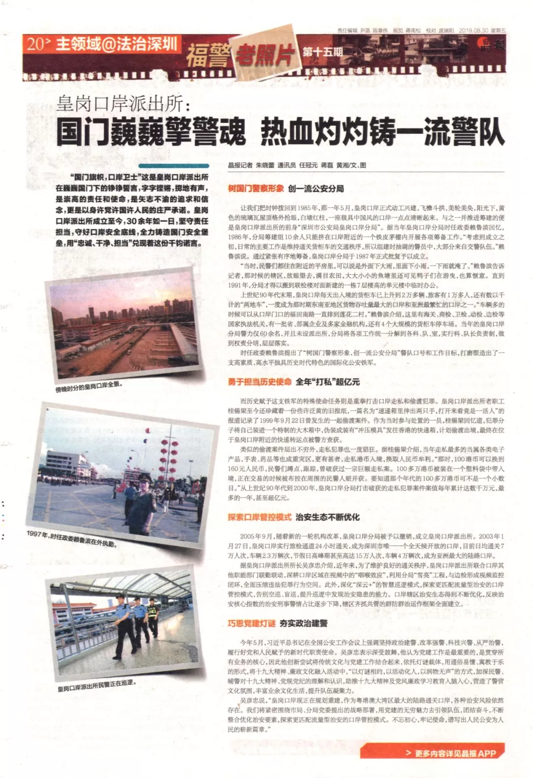 上世紀90年代末期,皇崗口岸每天出入境的貨柜車已上升到2萬多輛、旅客有1萬多人,還有數以千計的“兩地車”,一度成為那時期東南亞地區(qū)貨物吞吐量最大的口岸和亞洲最繁忙的口岸之一?!败囕v多的時候可以從口岸門口的福田南路一直排到蓮花二村?!辟圁敒I介紹,這里有海關、商檢、衛(wèi)檢、動檢、邊檢等國家執(zhí)法機關,有一批省、部屬企業(yè)及多家金融機構,還有4個大規(guī)模的貨柜車停車場。當年的皇崗口岸分局警力僅60余名,并且未設派出所,分局將各項工作統(tǒng)一分解到各科、隊、室,實行科、隊長負責制,做到權責分明,層層落實。