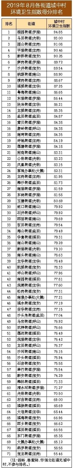 全市城中村首次單獨(dú)“應(yīng)考”,成績(jī)?nèi)绾??根?jù)公布的測(cè)評(píng)結(jié)果,深圳市城中村環(huán)境衛(wèi)生指數(shù)為79.05分,光明區(qū)、羅湖區(qū)、龍崗區(qū)城中村環(huán)境衛(wèi)生指數(shù)位列三甲,城中村人口密度較大的福田區(qū)則在首次公布的城中村環(huán)境衛(wèi)生指數(shù)排名中墊底。排名前3的街道分別是桂園街道(羅湖)、馬田街道(光明)和園山街道(龍崗),而排名后3的街道分別是寶龍街道(龍崗)、燕羅街道(寶安)和大鵬辦事處(大鵬)。