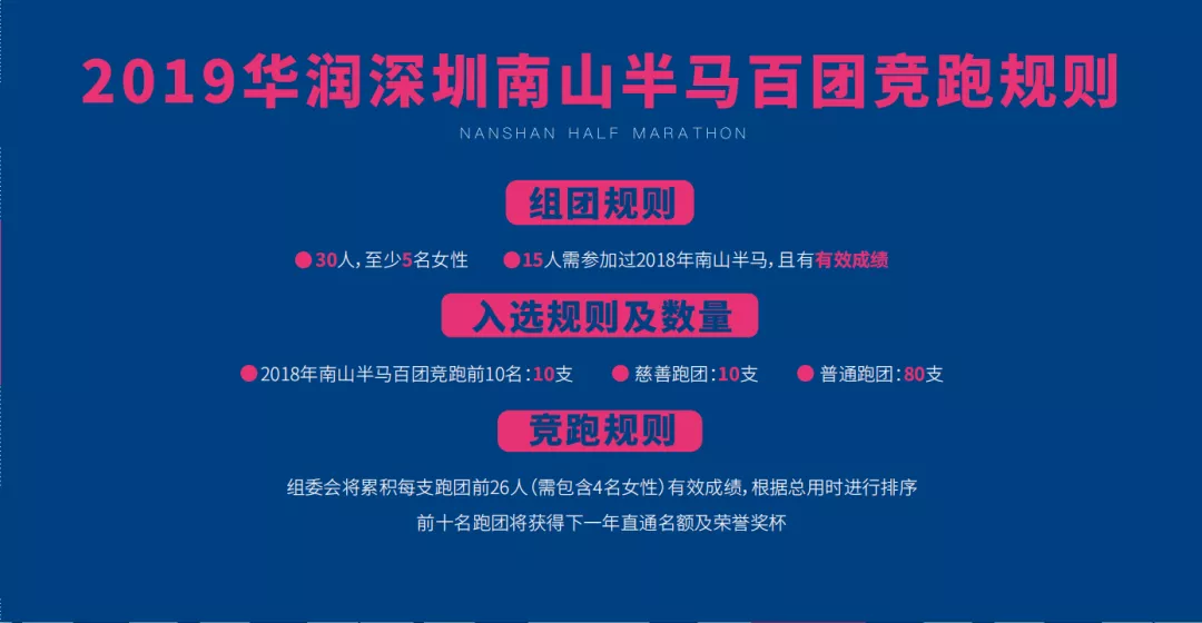 注:30名跑團團員中,至少有15人及以上人數(shù)參加過2018華潤深圳南山半程馬拉松賽,否則不予以排名入選資格