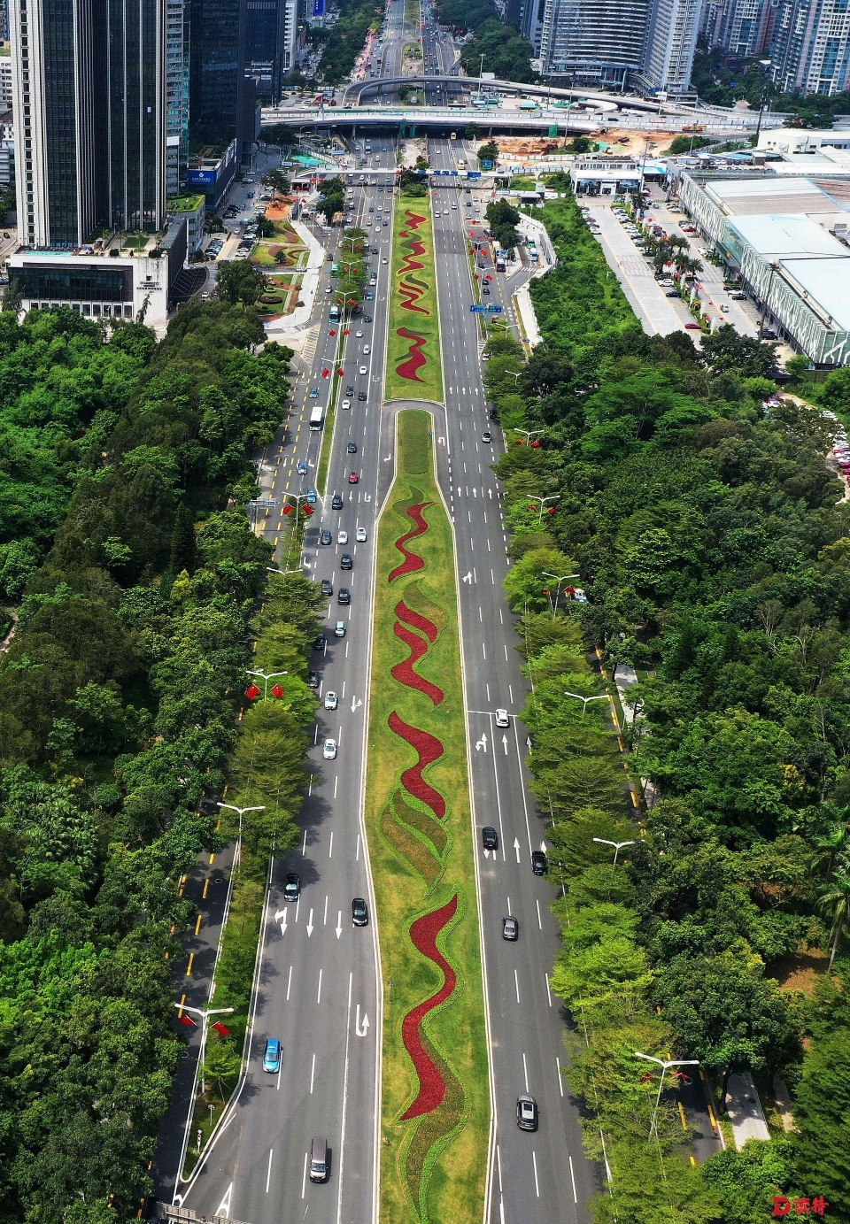 車輛行駛在深南大道上,沿路多處可以看到綠化工人們正在綠化帶上忙碌著,種植鮮花,修剪草坪,澆水養(yǎng)護。深南大道東段中間帶上,大紅色的赤壁,搭配藍色、粉色的大花香彩雀以及白里透粉的夏堇,共同組成了流線型的“鳳凰飛羽”圖案造型。從高處看去,綠化帶與兩側路燈上懸掛的鮮艷的國旗交相輝映,濃濃的節(jié)日氣息撲面而來。