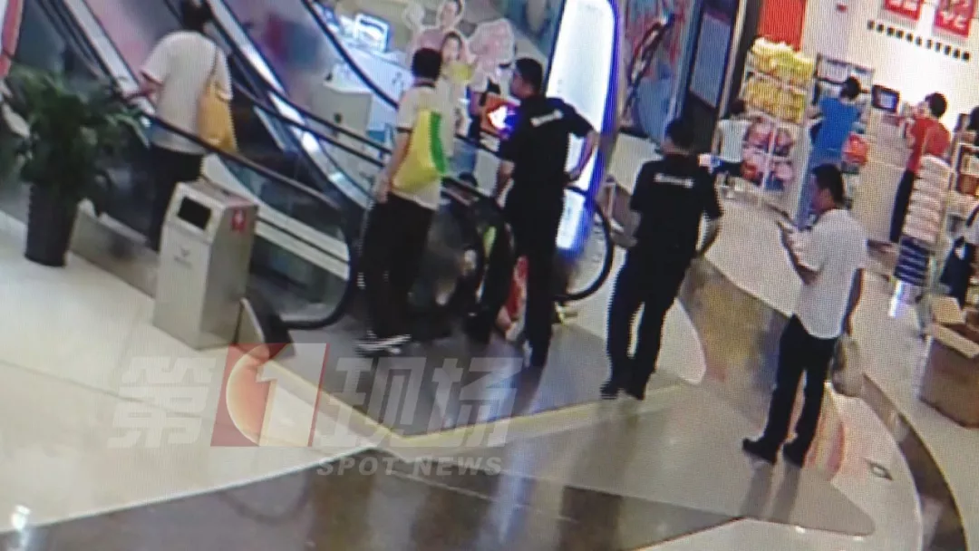 在商場的自動扶梯上,兒子的洞洞鞋被卷進了扶梯的空隙導致腳拔不出來。