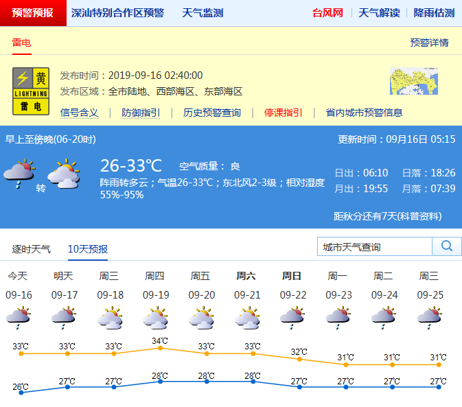 見圳客戶端·深圳新聞網(wǎng)2019年9月16日訊 深圳市氣象臺(tái)預(yù)計(jì),周一我市多云,有短時(shí)(雷)陣雨,部分時(shí)間雨勢(shì)稍大,氣溫26-33℃;周二至周日多云到晴天,天氣趨于悶熱,午后局地有短時(shí)陣雨。