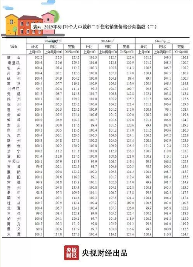 央視財經(jīng)2019年9月18日訊 近日,國家統(tǒng)計局發(fā)布了8月份70個大中城市商品住宅銷售價格變動情況:一二線城市新建商品住宅和二手住宅銷售價格環(huán)比、同比漲幅均與上月相同或回落;三線城市新建商品住宅銷售價格環(huán)比漲幅與上月相同,二手住宅漲幅微升。