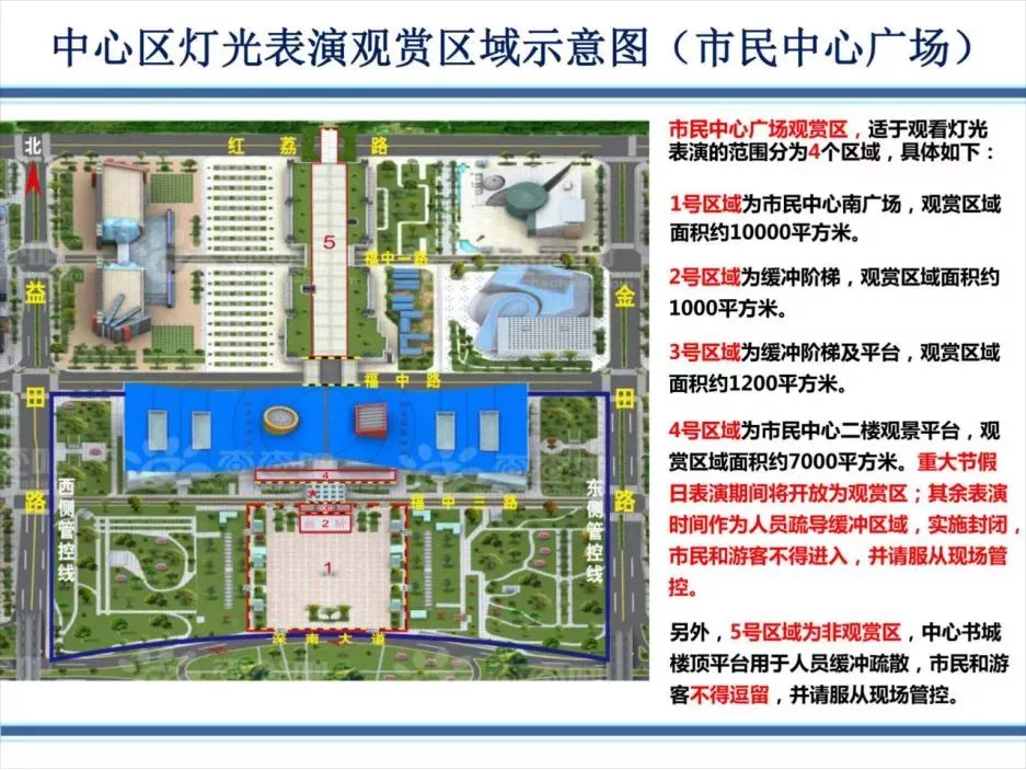 根據(jù)安排,除了福田中心區(qū),南山和寶安區(qū)國(guó)慶節(jié)前后燈光表演播放時(shí)間從2019年9月20日開始至10月15日每天晚上舉行三場(chǎng)燈光表演。