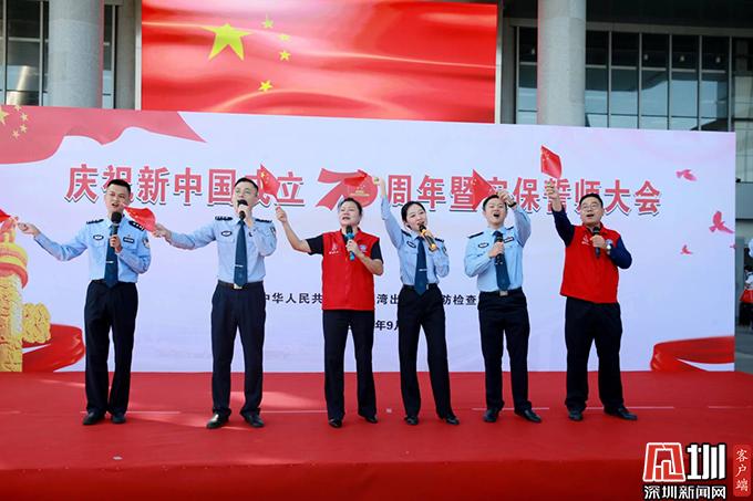 大會現(xiàn)場,一面巨幅國旗在12名邊檢民警的護衛(wèi)下,在會場正中位置迎風(fēng)拂動;國旗兩側(cè),由深圳灣邊檢站民警、地方公安民警、駐地武警官兵、口岸輔警及口岸U站志愿者組成的方陣依次排列。