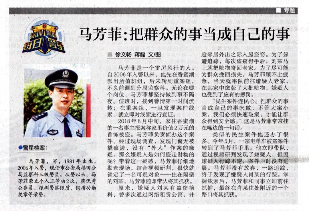 “民生案件連民心。把群眾的事當(dāng)成自己的事來(lái)做,不管大案小案,我們必須快速破案,才能讓群眾得到安全感?!边@是馬芳菲常常掛在嘴邊的一句話。