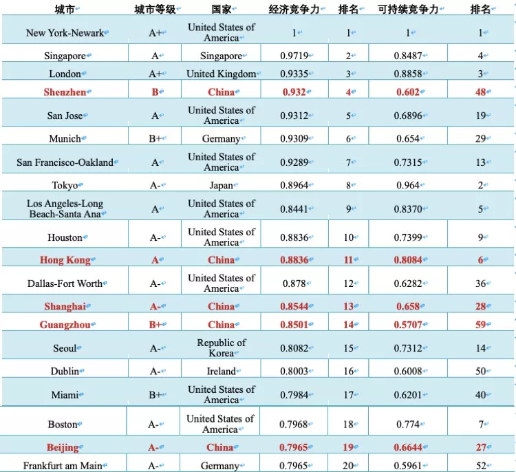《報(bào)告》最重要的工作之一,就是通過(guò)對(duì)全球1007個(gè)城市的“經(jīng)濟(jì)競(jìng)爭(zhēng)力”進(jìn)行測(cè)度。而測(cè)度結(jié)果顯示,2018年全球城市經(jīng)濟(jì)競(jìng)爭(zhēng)力指數(shù)二十強(qiáng):紐約、新加坡、倫敦、深圳、圣何塞、慕尼黑、舊金山、東京、洛杉磯、休斯頓、香港、達(dá)拉斯、上海、廣州、首爾、都柏林、邁阿密、波士頓、北京和法蘭克福。
