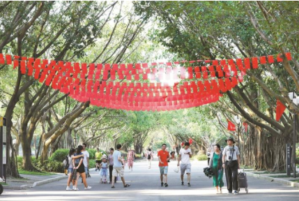 蓮花山公園打造了約4000平方米的花壇和花境,布置了約3000平方米的簕杜鵑花海;深圳灣公園營造了近1萬平方米的流花山“紅飄帶”大型花海;園博園布置了以“園舞曲”為主題的近4000平方米大型花壇,花壇內(nèi)設有4個直徑約6米的大型國慶主題構件。還有筆架山公園、荔枝公園、人民公園等19個公園,布置主題花壇31處,花境、花帶面積約2.7萬平方米。此外,約10000余面國旗及近5000串小國旗飄揚在22個市屬公園,在藍天白云映襯下顯得格外鮮紅,營造出共慶新中國華誕的濃厚氛圍。
