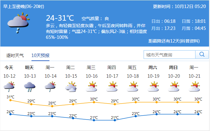 見圳客戶端·深圳新聞網(wǎng)2019年10月12日訊 據(jù)深圳市氣象臺消息,今日深圳多云,有輕微至輕度灰霾,午后至夜間轉陣雨,并伴有短時雷暴;氣溫24-31℃;偏東風2-3級;相對濕度65%-100%