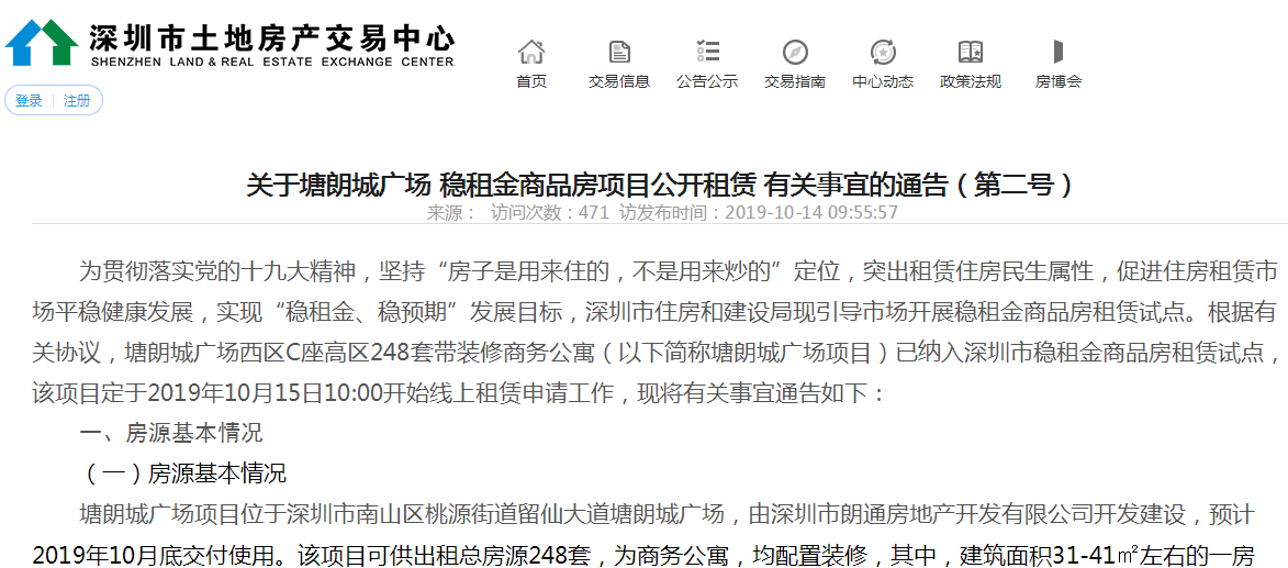 晶報2019年10月15日訊 怕房東亂漲價?怕租房合同不到期就趕人?穩(wěn)租金房來了!10月14日,深圳房地產(chǎn)交易中心官網(wǎng)發(fā)布了《關(guān)于塘朗城廣場穩(wěn)租金商品房項目公開租賃有關(guān)事宜的通告》,房源為南山區(qū)塘朗城廣場的248套帶裝修商務(wù)公寓,首批基準(zhǔn)租金標(biāo)準(zhǔn)暫為110元/月?平方米,定于10月15日10:00開始線上租賃申請工作。