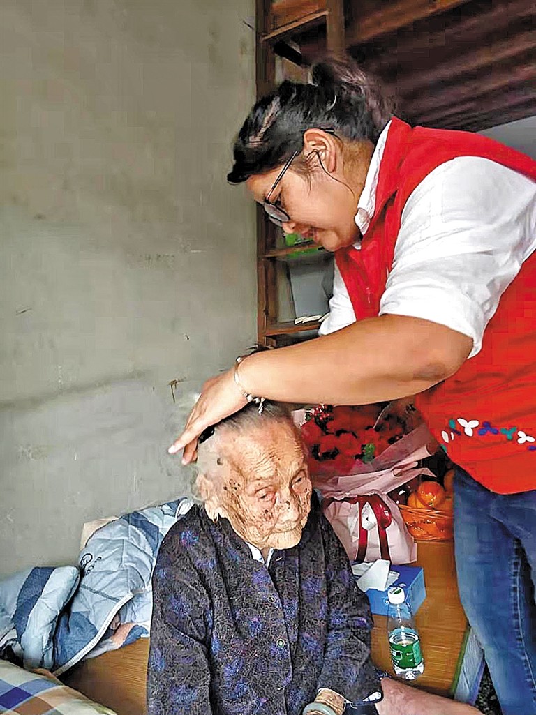 采訪(fǎng)當(dāng)天,老人看到來(lái)了這么多人,以為又是政府工作人員來(lái)慰問(wèn)她了,好奇地問(wèn)外孫女:“今天是過(guò)節(jié)嗎?”原來(lái),逢年過(guò)節(jié)陳汝金都會(huì)收到慰問(wèn)和祝福,社區(qū)工作人員和社康醫(yī)生也會(huì)經(jīng)常上門(mén)和她聊聊家常,了解老人家的身體狀況,因此老人對(duì)黨和政府送慰問(wèn)送祝福一點(diǎn)都不陌生。去年,陳汝金老人剛滿(mǎn)百歲,鳳凰社區(qū)黨委還專(zhuān)門(mén)組織大家來(lái)到老人家中,為老人慶祝百歲生日,并送來(lái)大家的祝福和問(wèn)候。