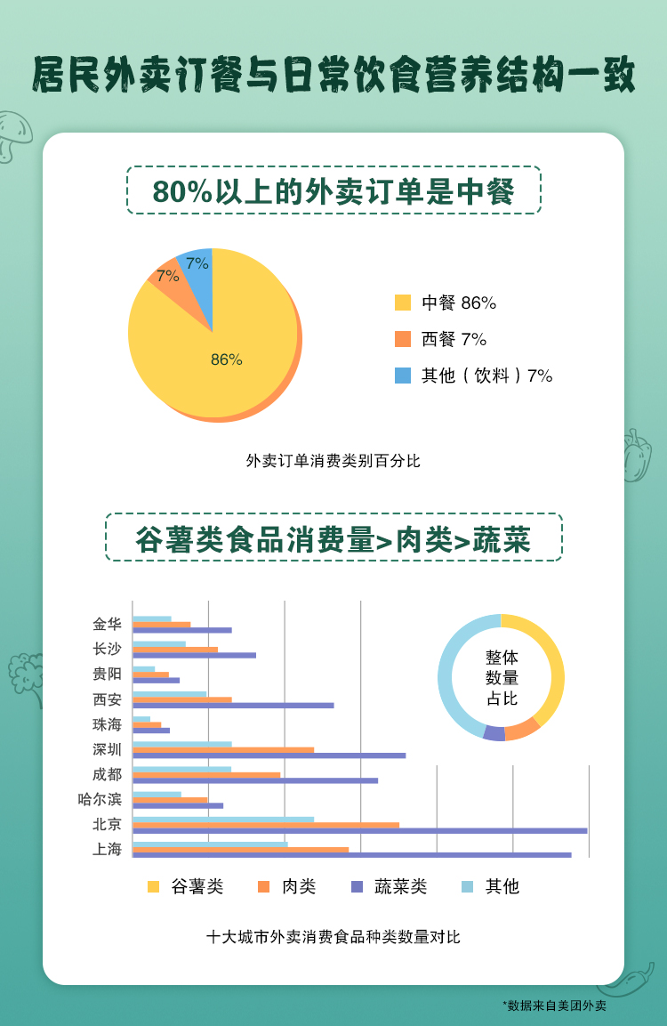 《我國10城市高頻外賣消費菜品膳食結構分析》報告研究指出十城市Top50消費菜品中,排第一的均為米飯,深圳居民對米飯及米制品的喜愛全國排名第一;十城中,油條在所有城市都進入了Top50;深圳和上海市民早餐最愛油條;珠海、哈爾濱居民尤其偏愛肉類食品,在訂制純肉類食品的頻次,哈爾濱城市排名最高,谷薯類食品對哈爾濱居民的吸引力比全國其他城市低;西安、北京更愛選擇主食和菜肴搭配,北京居民對肉類食物的興趣度比全國其他城市低。此外,整體來看,最受歡迎的肉類是豬肉、雞肉、牛肉,最受歡迎的蔬菜是白菜、包菜、西紅柿。