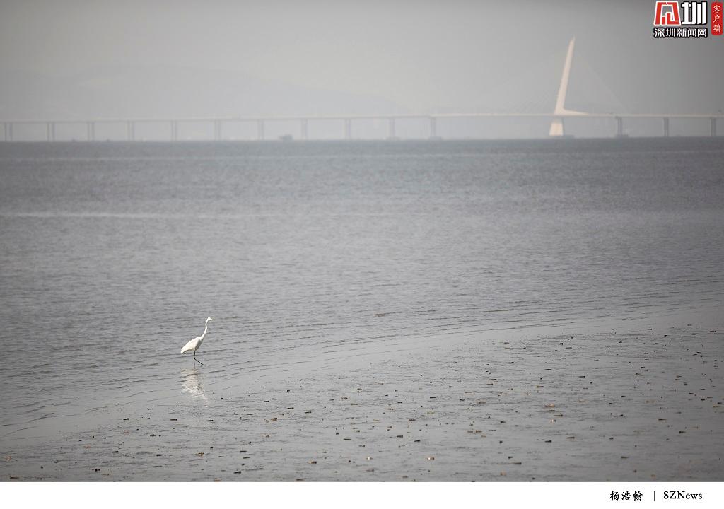 2019年10月17日,深圳灣公園,鳥類的白色羽毛和遠處白色的深圳灣公路大橋,成了一景。