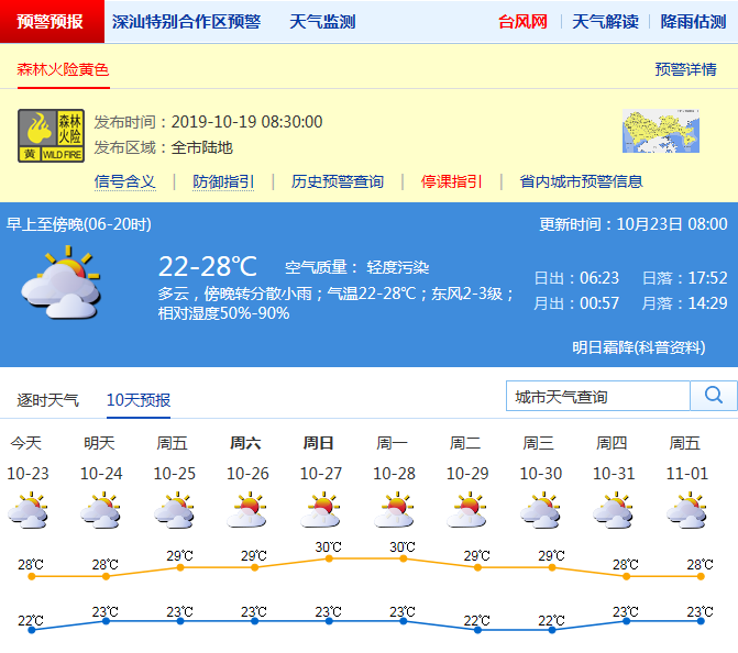 見圳客戶端·深圳新聞網(wǎng)2019年10月23日訊 近期深圳天氣持續(xù)干燥。深圳市氣象臺(tái)預(yù)計(jì),23-24日云量增多有分散小雨:23日云量增多,有分散小雨,24日分散小雨轉(zhuǎn)多云,最低氣溫21-22℃、最高氣溫27-28℃;25-29日多云到晴,空氣干燥。