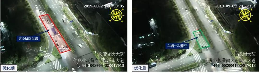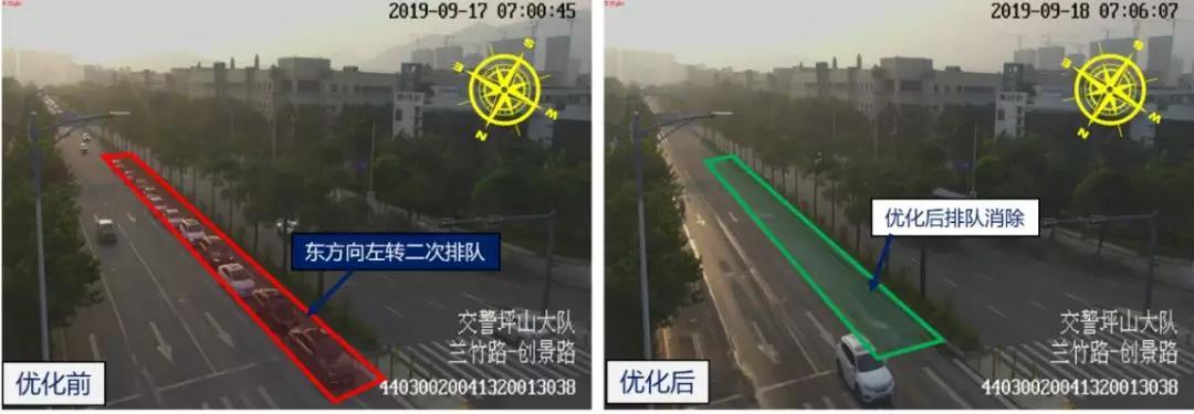 針對這一問題,深圳交警根據(jù)路口各時段、各方向的通勤需求,調(diào)整優(yōu)化了路口紅綠燈配時方案,適當(dāng)增加了擁堵方向時間。優(yōu)化后,路口晚高峰西往東方向車輛排隊由300多米降至60米左右,下降80%,車輛基本實現(xiàn)1次通行。