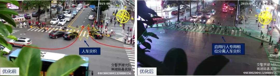 針對(duì)現(xiàn)狀問題,深圳交警采用單周雙次的信控策略,小批量、多頻次地放行嘉賓路方向車輛,緩解因公交車隊(duì)列化導(dǎo)致路口交通鎖死的問題;同時(shí),采用行人專用相位集中放行行人,保障行人過街安全。路口優(yōu)化后,路口“回堵”現(xiàn)象顯著減少,行人過街安全性提高,路口高峰小時(shí)通過量從2130pcu/h增至2285pcu/h,上升7.28%。