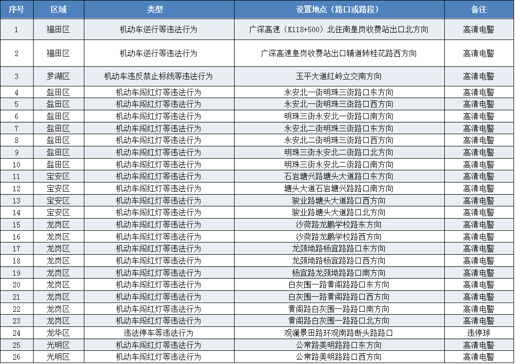 見圳客戶端·深圳新聞網(wǎng)2019年11月2日訊 日前,記者從深圳市公安局交通警察局獲悉,為確保交通執(zhí)法工作的公開公正、體現(xiàn)人性化管理,深圳市公安局交通警察局啟用了26套固定式交通技術監(jiān)控設備。其中,高清電警25套,違停球1套,分別設置在福田區(qū)、羅湖區(qū)、鹽田區(qū)、寶安區(qū)、龍崗區(qū)、龍華區(qū)、光明區(qū)等7個區(qū)。那么,這些“電子警察”分別在以上7個區(qū)的哪些路口“站崗”?下面一起看看↓↓