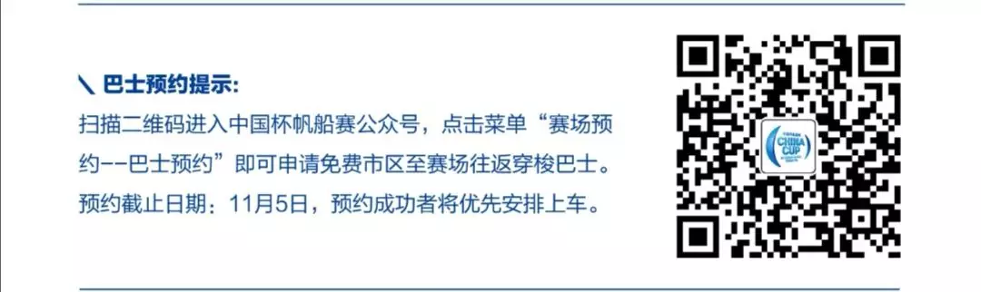 掃描二維碼進入中國杯帆船賽公眾號,點擊菜單“賽場預約-巴士預約”,即可申請免費市區(qū)至賽場往返穿梭巴士。預約截止日期:11月5日,預約成功者將優(yōu)先安排上車。