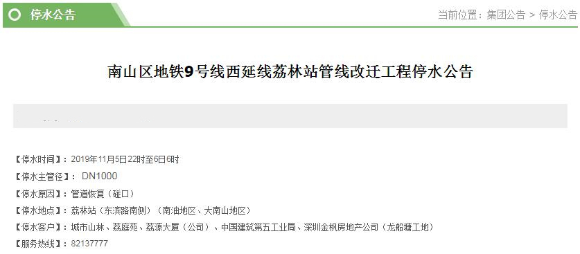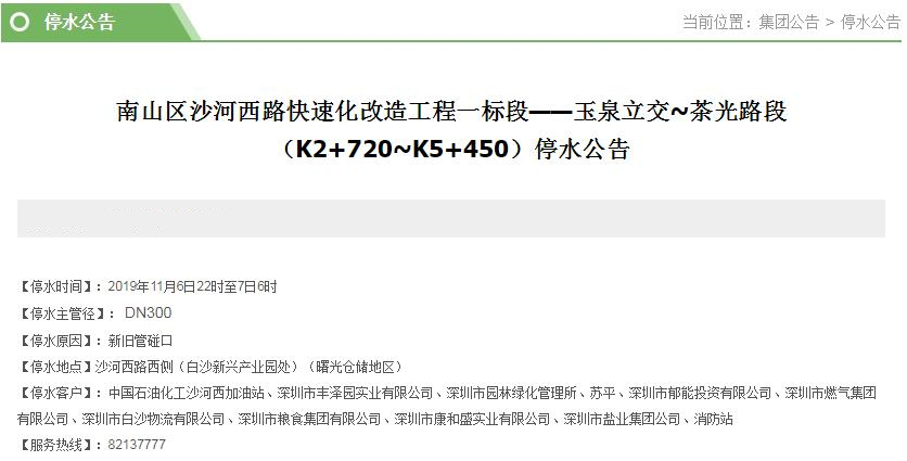 停水客戶:中國石油化工沙河西加油站、深圳市豐澤園實業(yè)有限公司、深圳市園林綠化管理所、蘇平、深圳市郁能投資有限公司、深圳市燃?xì)饧瘓F(tuán)有限公司、深圳市白沙物流有限公司、深圳市糧食集團(tuán)有限公司、深圳市康和盛實業(yè)有限公司、深圳市鹽業(yè)集團(tuán)公司、消防站