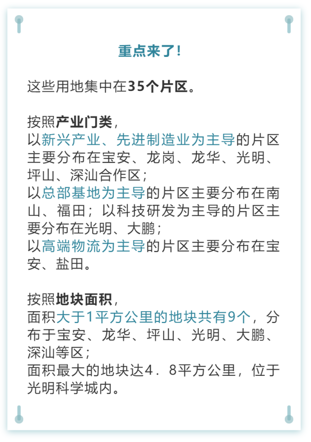根據(jù)梳理,此次可供應產(chǎn)業(yè)用地共35塊,總面積超過30平方公里。其中深圳市域范圍內(nèi)可供應產(chǎn)業(yè)用地約25平方公里,深汕合作區(qū)可供應產(chǎn)業(yè)用地約5平方公里,未來凡是符合深圳產(chǎn)業(yè)導向,符合高質(zhì)量發(fā)展要求的企業(yè)和項目都將得到充足的空間保障。