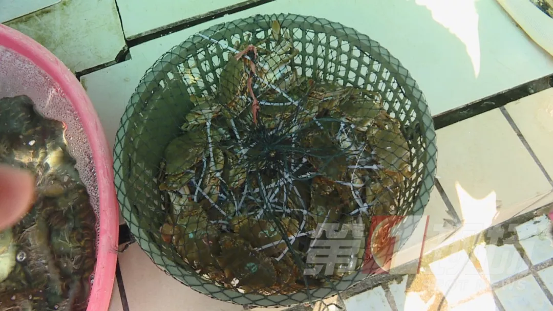 ▲粗大的紅色綁蟹繩,吸水后重半斤,這樣的膏蟹商家賣85元/斤。