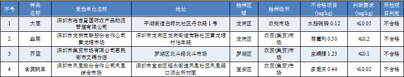 見(jiàn)圳客戶端·深圳新聞網(wǎng)2019年11月12日訊 11月11日,深圳市市場(chǎng)監(jiān)督管理局發(fā)布9月16日-9月20日深圳市農(nóng)產(chǎn)品質(zhì)量安全豬肉和蔬菜例行監(jiān)測(cè)結(jié)果。2019年9月16日-9月20日,深圳市市場(chǎng)監(jiān)督管理局在全市監(jiān)測(cè)豬肉產(chǎn)品53份,抽檢結(jié)果顯示全部樣品合格。抽檢蔬菜共124份,4份抽樣樣品不合格,都為農(nóng)藥檢測(cè)超標(biāo)。其中,深圳市海吉星國(guó)際農(nóng)產(chǎn)品物流管理有限公司銷(xiāo)售的大蔥水胺硫磷超標(biāo),深圳市龍崗南聯(lián)股份合作公司黃龍?zhí)潦袌?chǎng)銷(xiāo)售的韭菜腐霉利超標(biāo),深圳市集貿(mào)市場(chǎng)有限公司惠民街市文錦分店銷(xiāo)售的芥藍(lán)蟲(chóng)螨腈超標(biāo),深圳市鳳凰股份合作公司鳳凰綜合市場(chǎng)銷(xiāo)售的食莢豌豆多菌靈超標(biāo)。