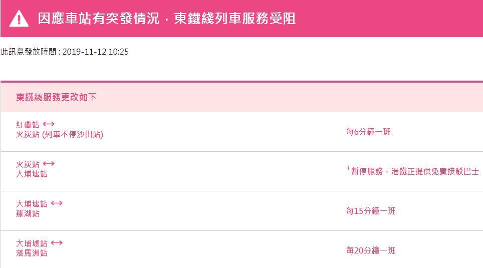 據(jù)港鐵官網(wǎng)目前最新消息,東鐵線列車運營服務調(diào)整為:紅磡站至火炭站每6分鐘一班;火炭站至大埔墟站暫停服務;大埔墟站至羅湖站每15分鐘一班;大埔墟站至落馬洲站每20分種一班。港鐵其他線路也有多處調(diào)整。
