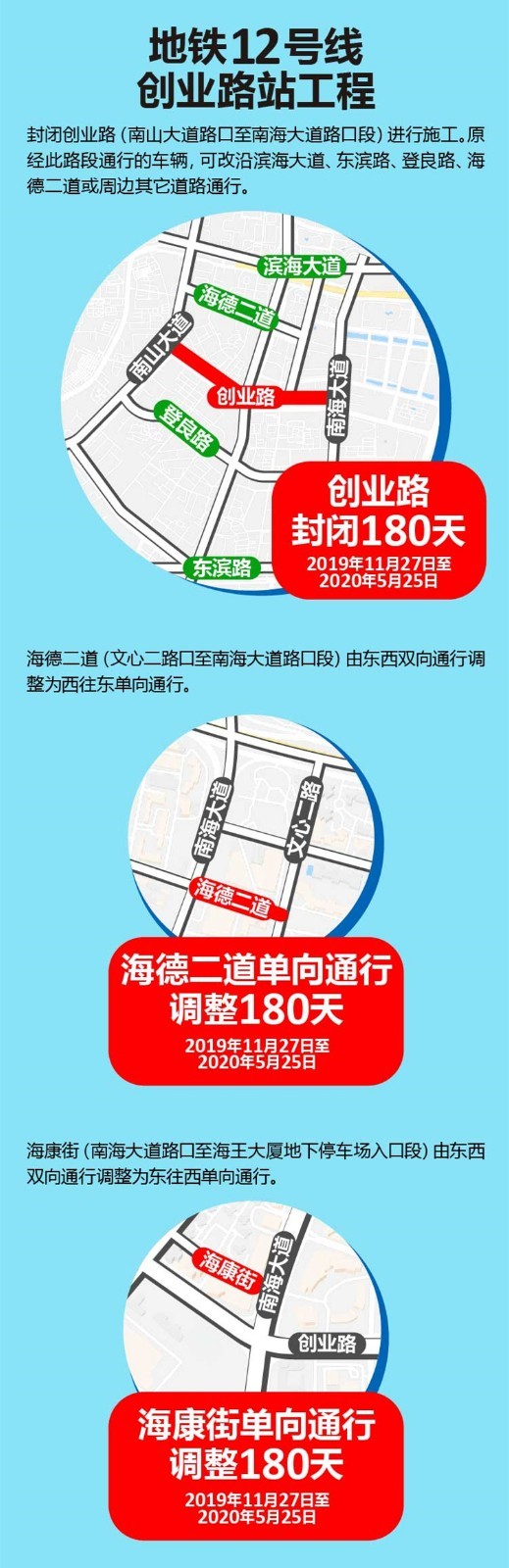 (一)2019年11月27日至2020年5月25日共180天,封閉創(chuàng)業(yè)路(南山大道路口至南海大道路口段)進(jìn)行施工。原經(jīng)此路段通行的車輛,可改沿濱海大道、東濱路、登良路、海德二道或周邊其它道路通行。