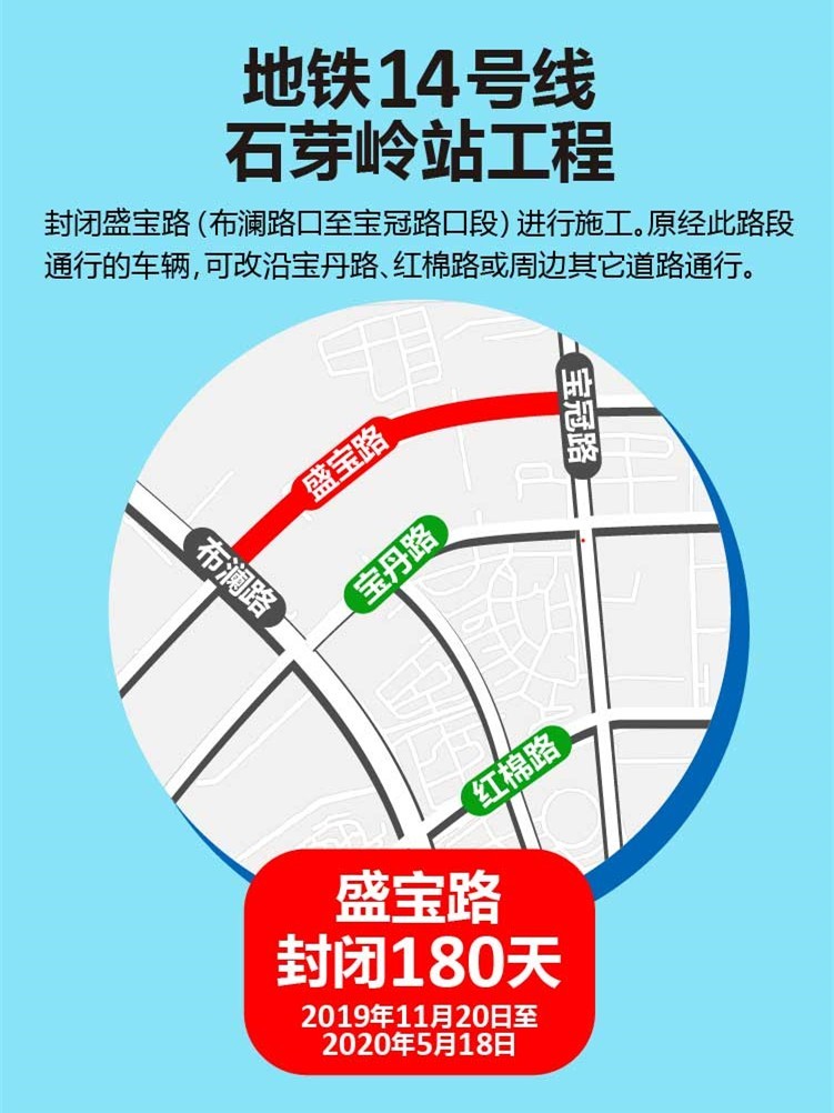 2019年11月20日至2020年5月18日共180天,封閉盛寶路(布瀾路口至寶冠路口段)進(jìn)行施工。原經(jīng)此路段通行的車輛,可改沿寶丹路、紅棉路或周邊其它道路通行。