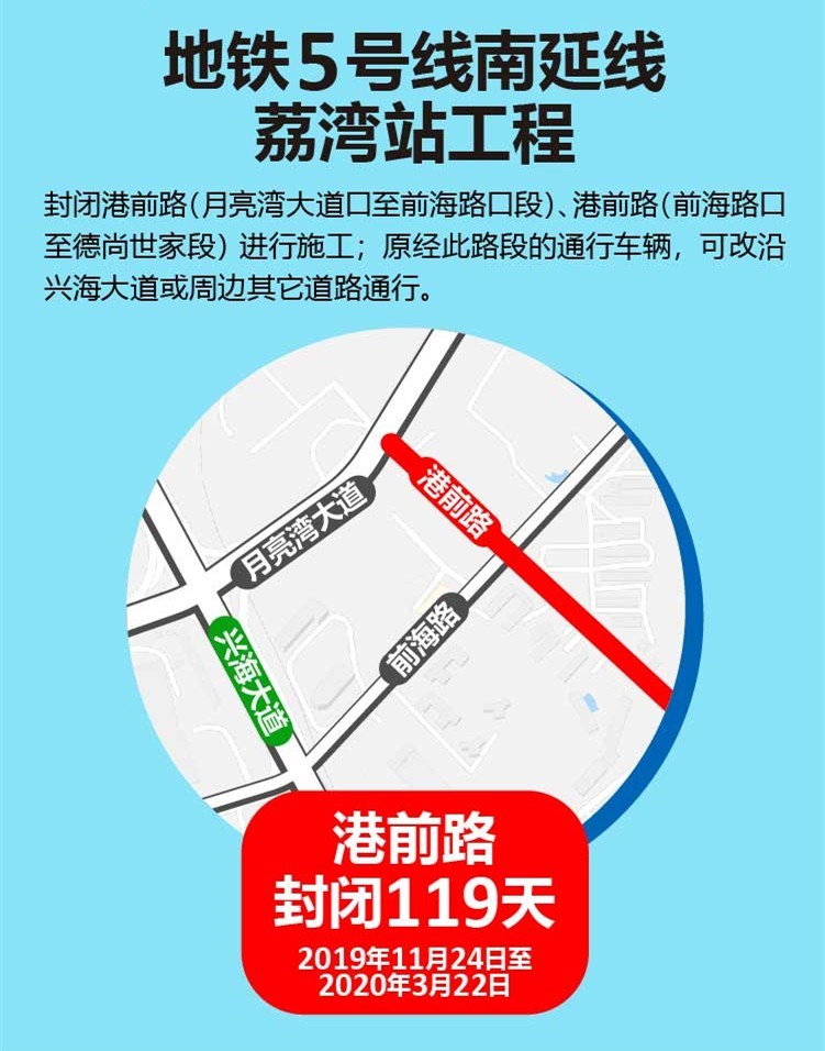 2019年11月24日至2020年3月22日共119天,封閉港前路(月亮灣大道口至前海路口段)、港前路(前海路口至德尚世家段)進(jìn)行施工;原經(jīng)此路段的通行車輛,可改沿興海大道或周邊其它道路通行。