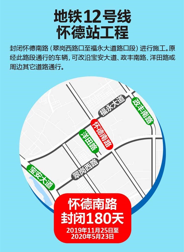 2019年11月25日至2020年5月23日共180天,封閉懷德南路(翠崗西路口至福永大道路口段)進(jìn)行施工。原經(jīng)此路段通行的車輛,可改沿寶安大道、政豐南路、洋田路或周邊其它道路通行。