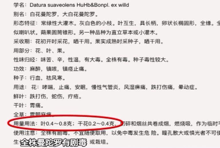 據(jù)了解,曼陀羅又名洋金花,有一定的藥用價(jià)值,但也有毒理作用,有多例報(bào)道介紹過(guò)曼陀羅致人中毒事件。據(jù)相關(guān)資料顯示,曼陀羅葉應(yīng)用藥0.4克至0.8克,干花用藥0.2克至0.4克,使用注意事項(xiàng)提及到,全株曼陀羅有劇毒,不宜隨便取用,以免中毒發(fā)生危險(xiǎn)。