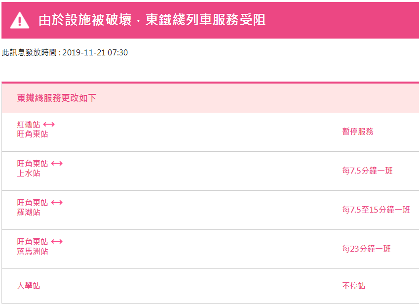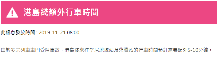 據(jù)港鐵消息,11月21日,香港地鐵各線(xiàn)(機(jī)場(chǎng)快線(xiàn)除外)、輕鐵及港鐵巴士的服務(wù)將于晚上11時(shí)結(jié)束。西鐵線(xiàn)/東鐵線(xiàn)紅磡站及大學(xué)站繼續(xù)關(guān)閉。需要注意的是,元朗站將于下午2時(shí)關(guān)閉,列車(chē)不停元朗站,此外,個(gè)別車(chē)站出入口會(huì)暫時(shí)關(guān)閉。