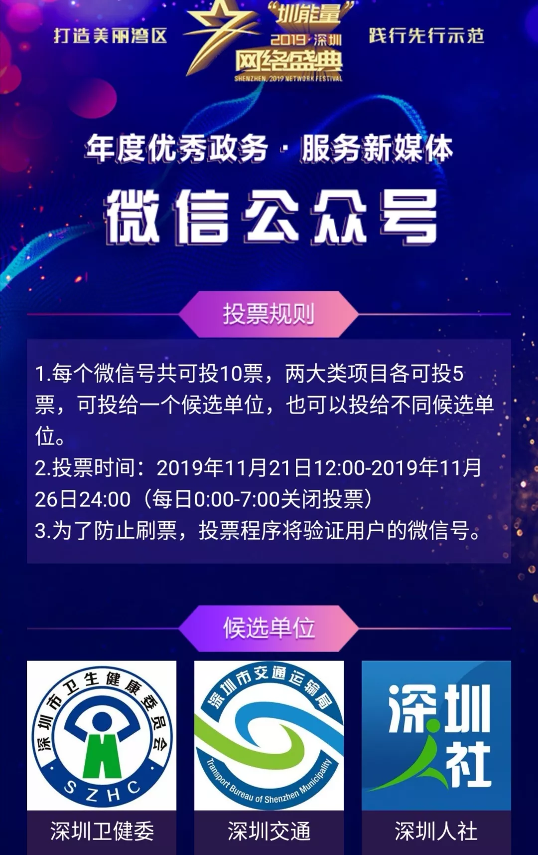 2.投票時(shí)間:2019年11月21日12:00-2019年11月26日24:00(每日0:00-7:00關(guān)閉投票)