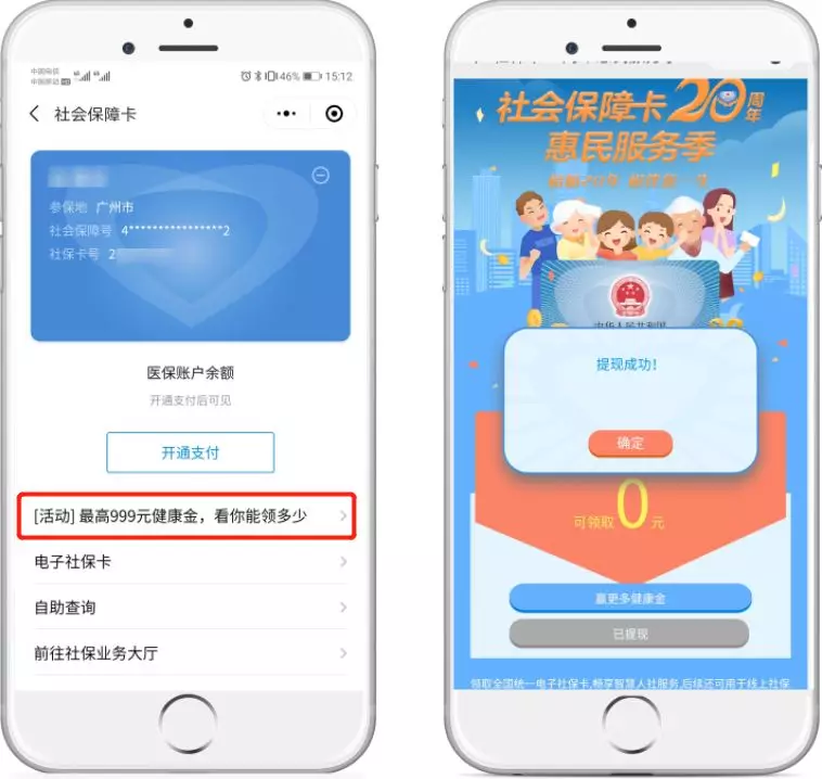 綁定電子社保卡后,可通過社保卡詳情頁,回到活動首頁,點擊“提現(xiàn)到零錢”,馬上提現(xiàn)。