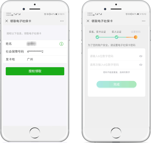 根據(jù)提示授權(quán)領(lǐng)取電子社???,并進行實人實名認證后,設(shè)置電子社??艽a,即可完成領(lǐng)取。