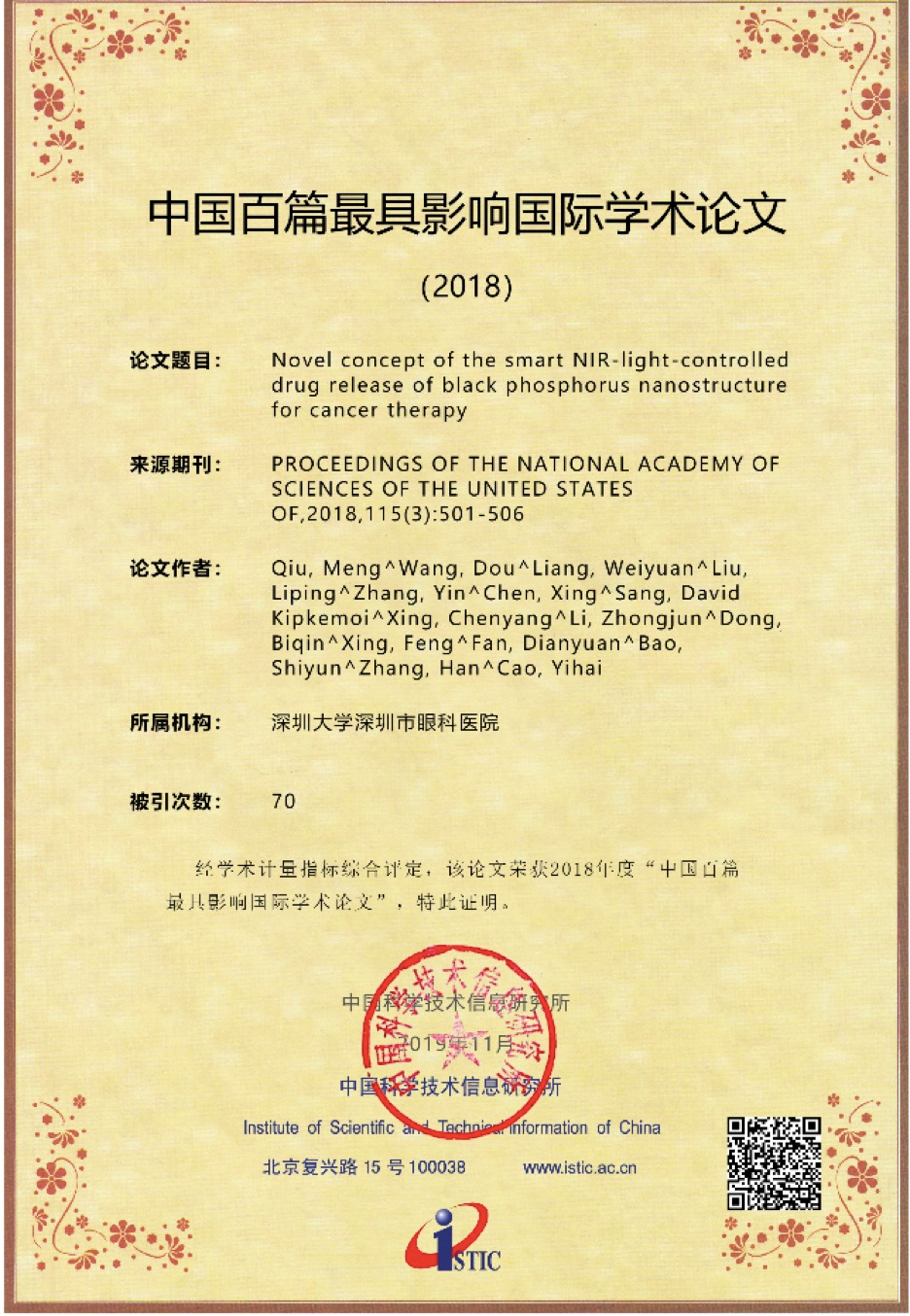 原標(biāo)題:2018年中國百篇最具影響國際學(xué)術(shù)論文公布,深大張晗課題組2篇論文入選