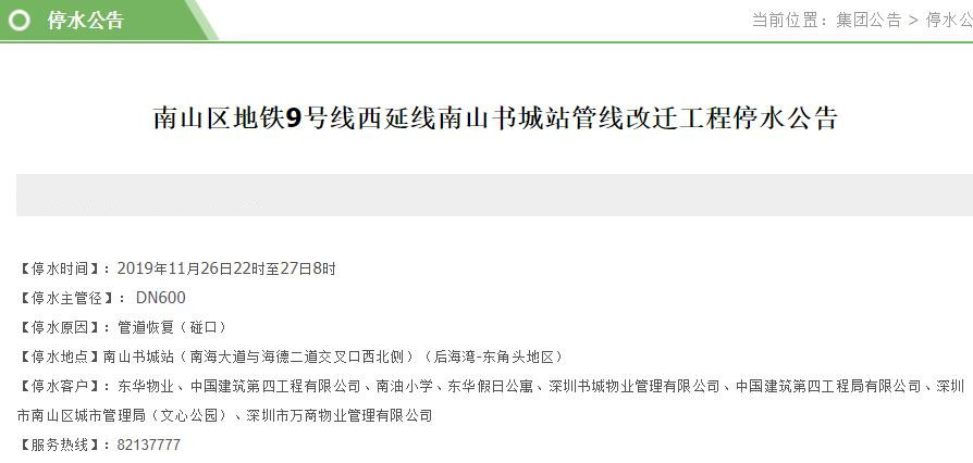 停水客戶:東華物業(yè)、中國(guó)建筑第四工程有限公司、南油小學(xué)、東華假日公寓、深圳書城物業(yè)管理有限公司、中國(guó)建筑第四工程局有限公司、深圳市南山區(qū)城市管理局(文心公園)、深圳市萬(wàn)商物業(yè)管理有限公司