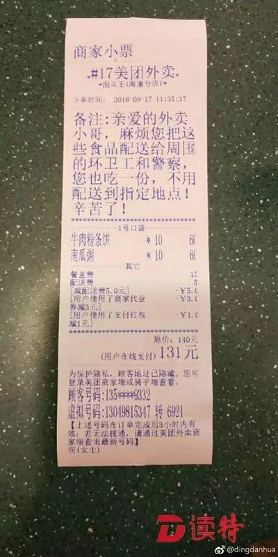 11點35分,面點王又收到了一張訂單。牛肉粉條餅和南瓜粥各10份,共計131元。員工發(fā)現(xiàn),這張訂單上的備注和名稱與此前的一模一樣,皆是讓外賣小哥送給周圍的環(huán)衛(wèi)工和警察。隨后,面點王其他分店也收到了類似的訂單。據(jù)面點王員工統(tǒng)計,何老師總計點了1300多元外賣。隨后,這些食物被分成180份送出。
