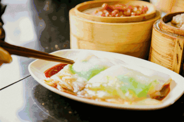 當(dāng)天還灰蒙蒙,大地還在沉睡之時,氤氳的水蒸氣便在賣腸粉的小店彌漫升騰,那是開啟一天忙碌的訊號。用米漿和蔬菜肉末雞蛋等等一起,在一格格的小抽屜里面蒸熟,再將特制的醬料淋上(喜辣的還可以加上辣椒),一道美味就此誕生。