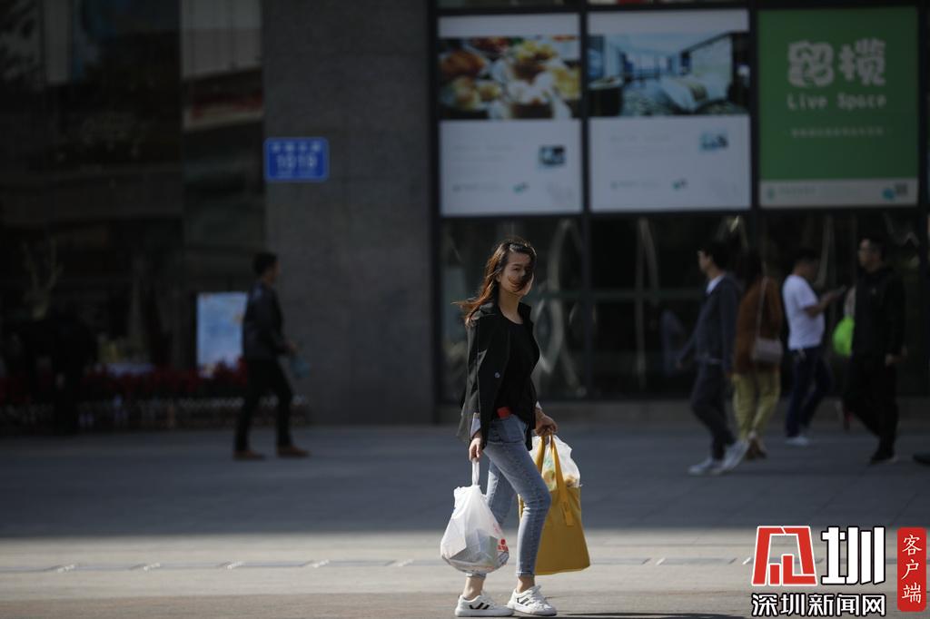 華強北商圈,大風吹亂了一位出行女士的頭發(fā)。