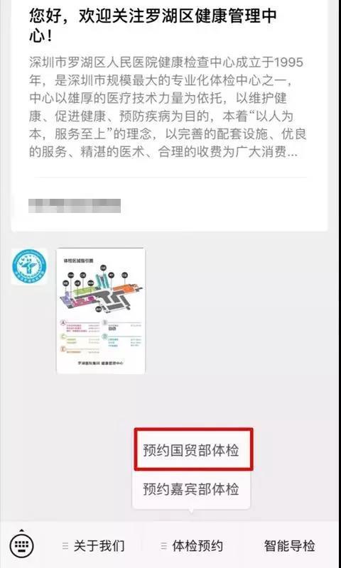 首先,關(guān)注公眾號“羅湖醫(yī)院集團健康管理中心”,進入公眾號點擊菜單欄“預(yù)約國貿(mào)部體檢”。