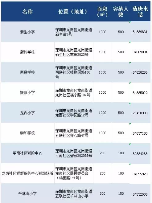 有備無(wú)患,也請(qǐng)收好這份龍崗街道各應(yīng)急避難場(chǎng)所信息表。