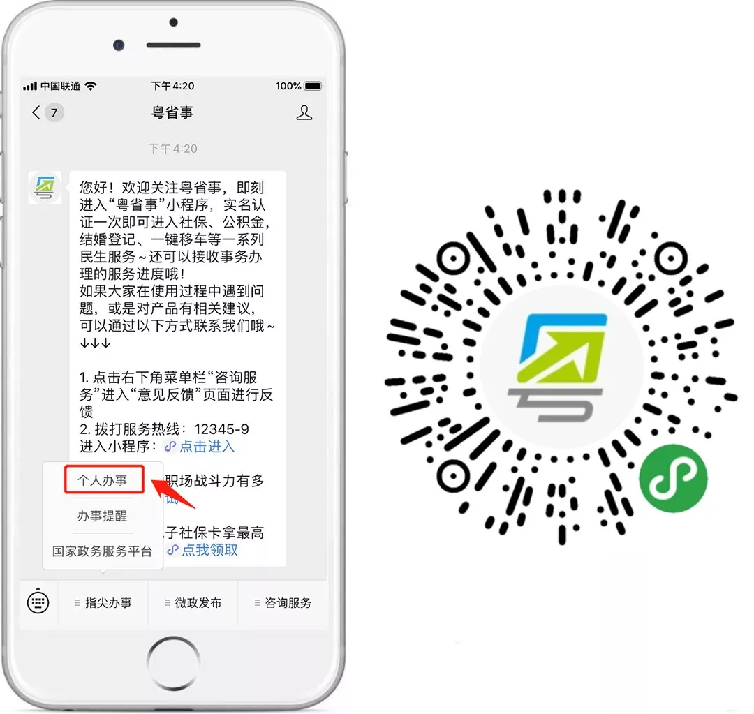 微信搜索并關(guān)注“粵省事”公眾號(hào),點(diǎn)擊菜單欄“指尖辦事”—“個(gè)人辦事”進(jìn)入“粵省事”小程序,或長(zhǎng)按識(shí)別右側(cè)葵花碼進(jìn)入小程序。