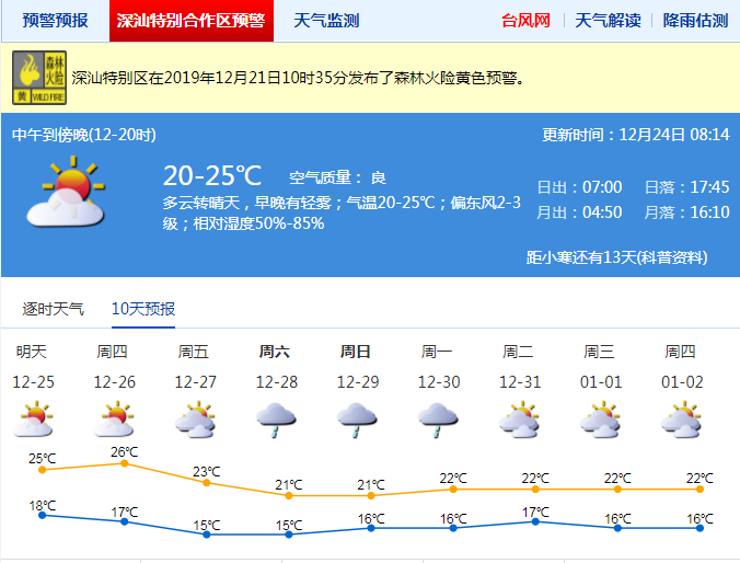 見圳客戶端·深圳新聞網(wǎng)2019年12月24日訊 今日多云,可見陽光,有輕霧或霾;氣溫20-25℃;東風2-3級;相對濕度55%-90%;25-26日多云,有輕霧或霾,白天溫暖;26日夜間至27日冷空氣影響,風力加大,沿海、高地和海區(qū)最大陣風7級左右,氣溫下降,天氣轉(zhuǎn)涼;28-30日云量增多,有一次降水過程。