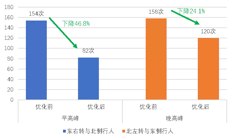 根據(jù)調研情況,交警對該路口人車交織方向的機動車放行時間進行拆分,第一部分僅放行機動車輛,第二部分放行行人,放行時間滿足行人安全過街需求,在周期不變的情況下,同時兼顧機動車與行人通行需求。