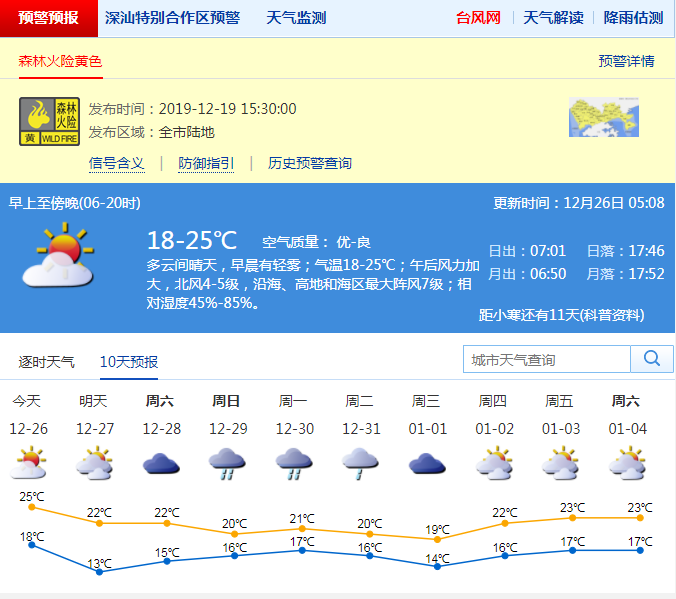 見圳客戶端·深圳新聞網(wǎng)2019年12月26日訊 今日白天多云,氣溫18-25℃,明天傍晚至27日受冷空氣影響,北風加大,沿海、高地和海區(qū)最大陣風7級左右,氣溫下降4-5℃,天氣轉涼。28日多云,29-30日有一次明顯降雨過程。