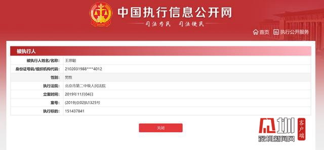 中國執(zhí)行信息公開網(wǎng)上發(fā)布的被執(zhí)行人王思聰信息頁面截圖。