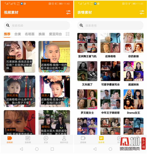 換臉軟件ZAO提供的視頻素材和表情素材頁面截圖。