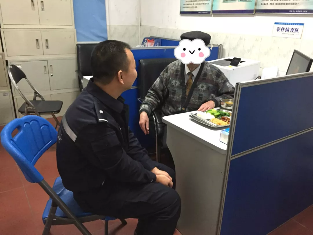 老人與派出所值班民警王研軍講述了自己前來的目的,看見老人一臉疲態(tài),王研軍立即安排地方給老人休息,并安排輔警吳海明供應午餐給老人食用。